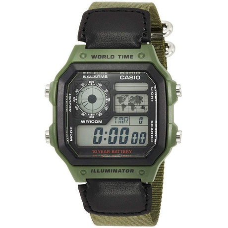 - IN STOCKPAY IN 30 DAYSCasio Casio Watch Digital World Time Illuminator Green Nato AE-1200WHB-3BVDF £33.99Unit price /Unavailable