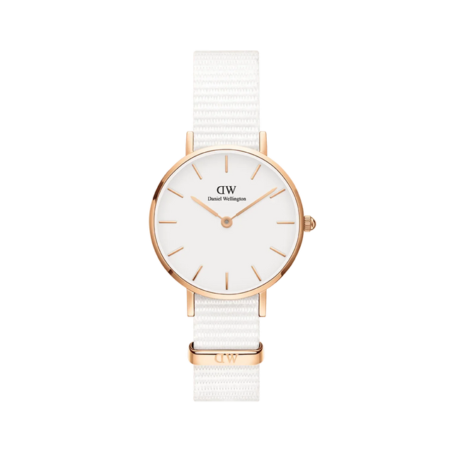 The Daniel Wellington Ladies Petite Dover White Watch DW00100313 is a beautifully crafted timepiece that exudes summer elegance. Inspired by the iconic white cliffs of Dover, this watch features an eggshell-white dial and rose gold details that perfectly complement the all-white NATO strap. The minimalist design and subtle color palette make it a versatile accessory that can be dressed up or down, capturing the essence of a classic, timeless look. Powered by a reliable Japanese Quartz movement, this watch ensures precision and style, while the interchangeable strap feature allows for personalised customisation.