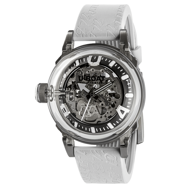 The U-Boat U-65 Automatic White blends contemporary design with visible mechanical precision, offering a striking skeleton display beneath its domed crystal. The exposed movement creates a dynamic and immersive visual experience.