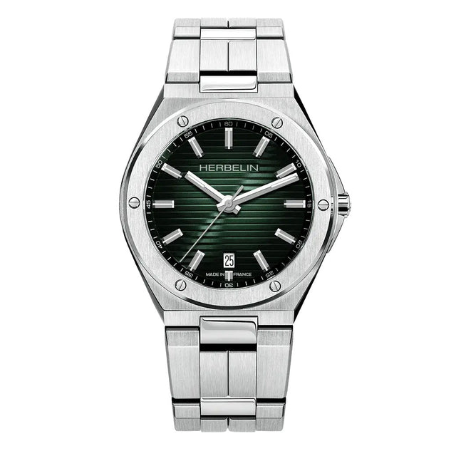 Cap Camarat embodies a sophisticated yet athletic aesthetic. The horizontally aligned green dial infuses a sense of elegance and contemporary flair. Stainless steel hands and indices shimmer with a radiant glow. Since 1947, Herbelin has been crafting its exquisite collections in Charquemont, showcasing unparalleled French craftsmanship.
