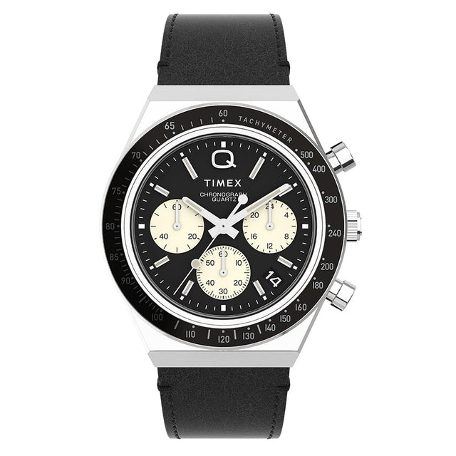Roar across the finish line with our high-performing Q Timex Chronograph. Inspired by the original motoring watches that graced the tracks of Europe’s most iconic races, this timepiece celebrates the endurance of our legendary 1970s Q Timex. An ultra-precise chronograph movement and black tachymeter bezel recreate the finesse and function of a true racing watch, allowing you to determine elapsed time and average speed like the greatest daredevils in motorsports. Contrasting sub-dials, a date feature, hand-applied dimensional indices, and an updated Q Timex logo smolder against a jet-black dial, while a brushed and polished stainless-steel case and crown bring dynamism and durability to its retro construction. Infinitely wearable, a black leather strap with quick-release spring bars makes for a sporty presentation that’s ready to hit the road whenever you are.