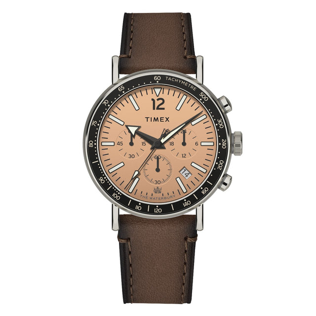 With its careful attention to detail, the Waterbury Standard Tachymeter Chronograph shines as one of our most refined everyday watches. Designed with versatility in mind, it brings together classic elements with modern materials, including a tachymeter index along its top ring to measure speed and distance. The faux leather strap in rich brown with a dégradé finish is derived from corn polymers rather than petroleum-based oils, making it a more sustainable choice compared to natural leather. This watch also features a date window, 100m of water resistance, dimensional applied indices, quick-release spring bars, and a gorgeous salmon dial. It’s a timepiece that keeps you going the distance without ever sacrificing style.